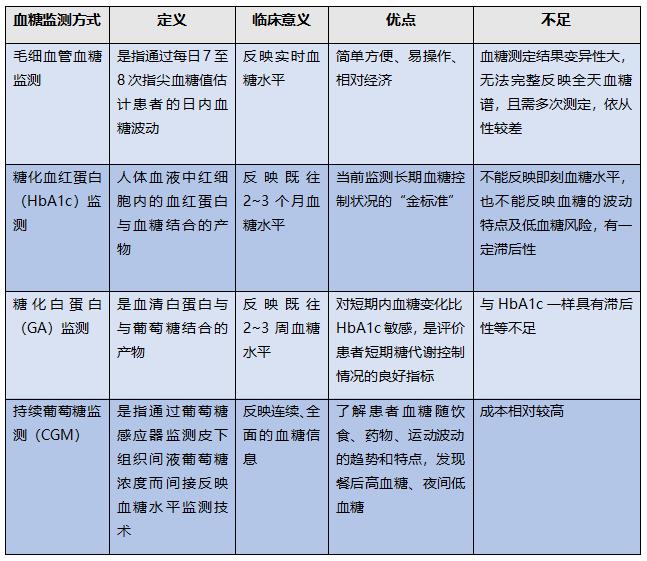 目前常用的血糖监测可分为毛细血管血糖监测、糖化血红蛋白(HbA1c)监测、糖化白蛋白(GA)监测和 CGM。相比于前三种血糖监测方式,CGM的优缺点,小U也给大家整理了: