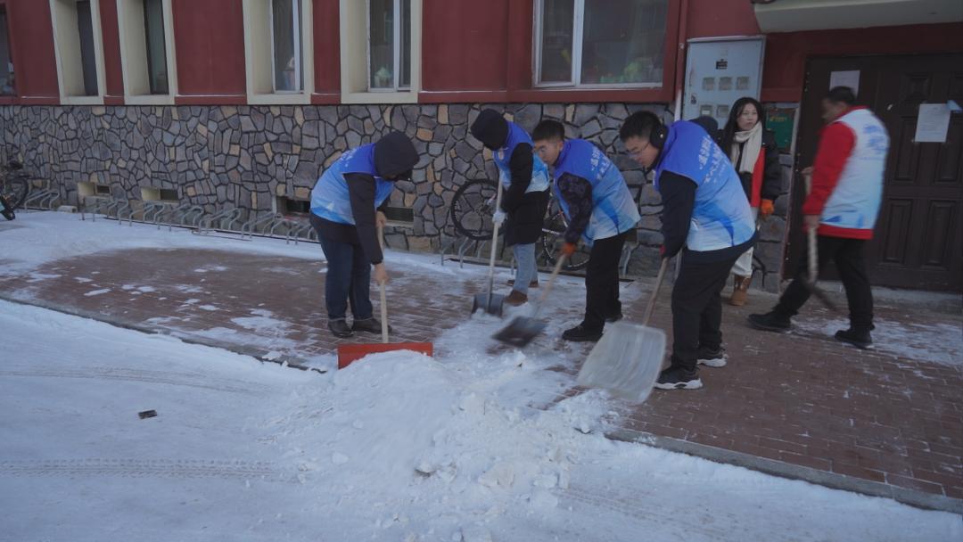 在神泉社区,由社区工作人员和居民组成的志愿者队伍正在清理住宅楼门口的积雪。随着气温的下降,为防止居民将积雪踩踏成硬滑难行的路面,志愿者们齐心协力,很快将积雪清理干净,畅通居民的出行路。