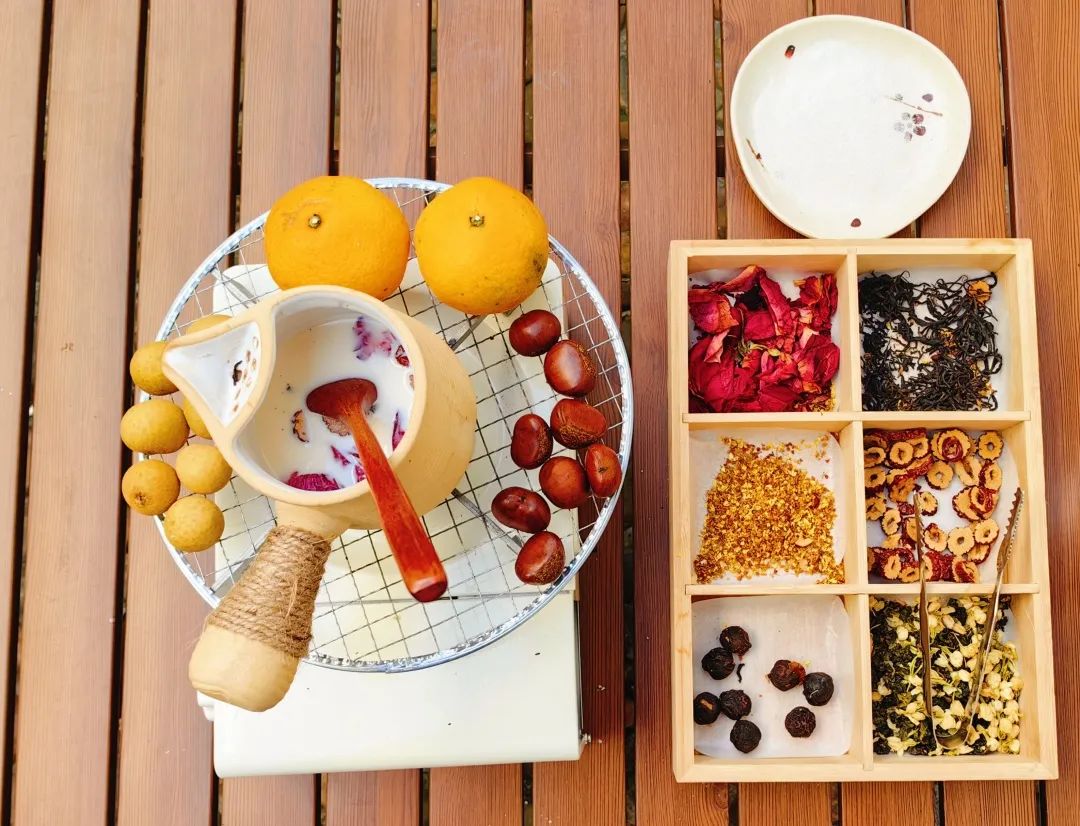 不仅如此,我市不少饮品店也开始售卖“罐罐烤奶”。位于卢宅景区非遗街区的“昉咖啡”便推出了顾客可自己操作的“罐罐烤奶”套餐:一份全套的“围炉罐罐烤奶”工具,一壶奶、一壶水、一碟糖,搭配装在六宫格里的茶叶、红枣、玫瑰花、桂花、茉莉花、干桂圆等,附加橘子、柿子、板栗等“烤物”,双人套餐标价78元。