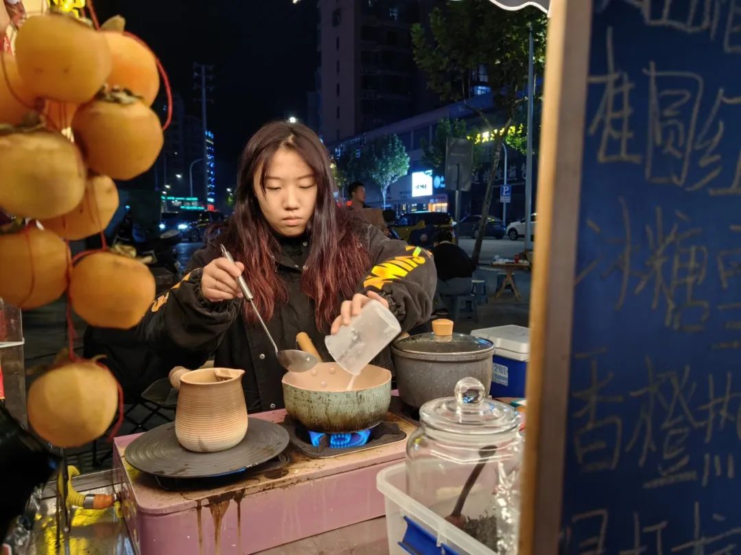 吴旸婷是一名“00后”,摆摊一年多来,她基本是紧跟潮流推出当时的热卖产品,有柠檬茶、泡面、鲷鱼烧、铜锣烧、热奶宝等,“这两年流行的东西变得很快,我比较喜欢研究,所有的产品都是我自己喜欢的,工具齐全,‘转型’起来也快。”吴旸婷说,进入秋冬,大家就更愿意为带有“温暖”感的情绪消费买单,“罐罐烤奶”是可以给消费者带来温暖、仪式感的饮品。