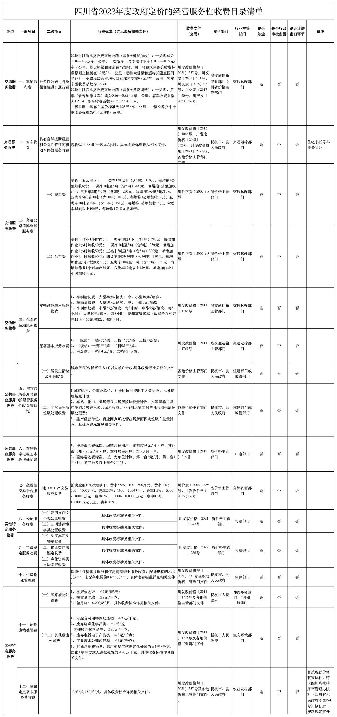 近日,四川省发展改革委发出通知公布了《四川省2023年度政府定价的经营服务性收费目录清单》、《四川省2023年度省级政府定价的涉企经营服务性收费目录清单》。四川省2023年度政府定价的经营服务性收费主要包括交通服务收费、公共事业服务收费、其他特定服务收费三大类别,每个类别又分一、二级项目,其中一级收费项目共12个,每项目收费公布了收费标准。