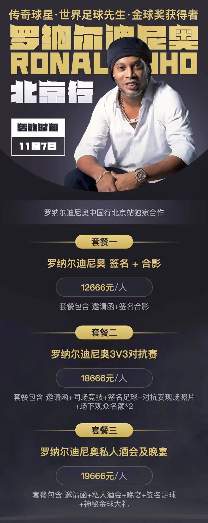 签名合影要花费上万,与小罗一起踢场3v3对抗赛的费用将近1万9,参加其私人酒会及晚宴,所需要的费用达到快2万。尽管已经退役多年,但是罗纳尔迪尼奥依旧凭借其在职业生涯期间收获的一大批粉丝,在当今的国际足坛拥有不俗的影响力。不过在主办方眼里,陪前金球先生踢场球的价格显然远没有吃顿饭的价钱高。