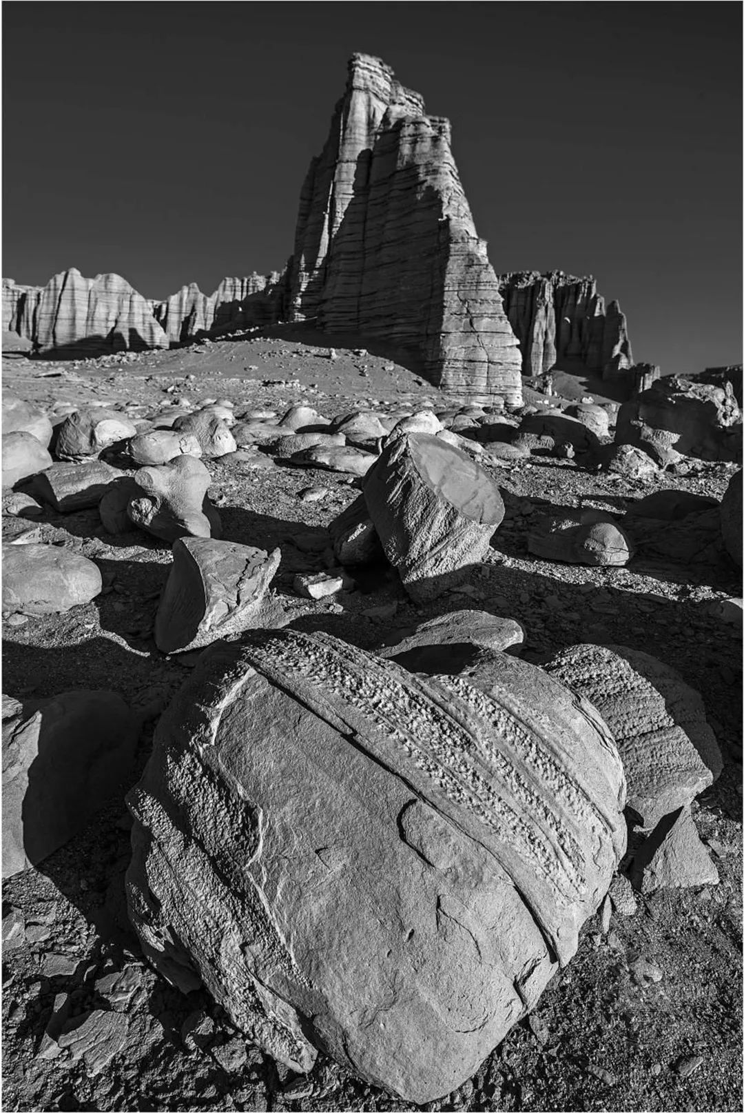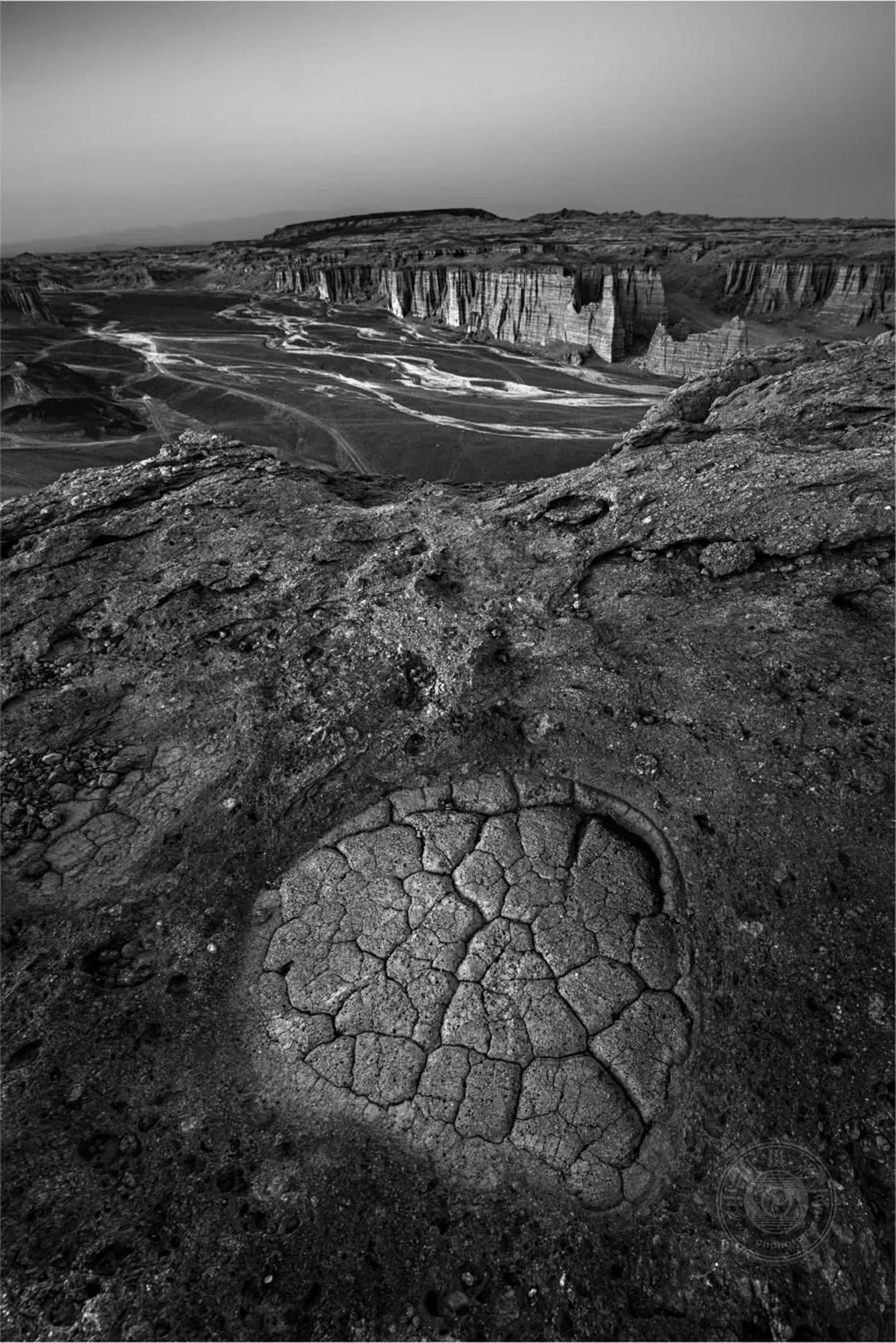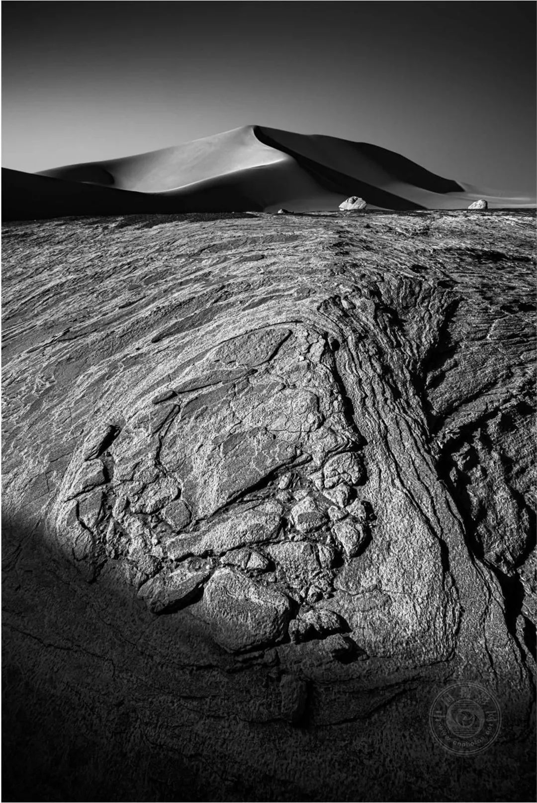 大海道——是我心中充满无限可能的地方,但是现实中的他却是那样的荒凉、那样的孤寂,它横跨吐哈盆地的南湖戈壁,属于典型的大陆性气候,干旱、多风、少雨,人迹罕至。遍地的火山岩,独特的雅丹地貌,无数造型奇特、风蚀肌理的岩石,它深深的吸引着我。我用黑白的表现形式,来表现我对它的敬畏与爱。