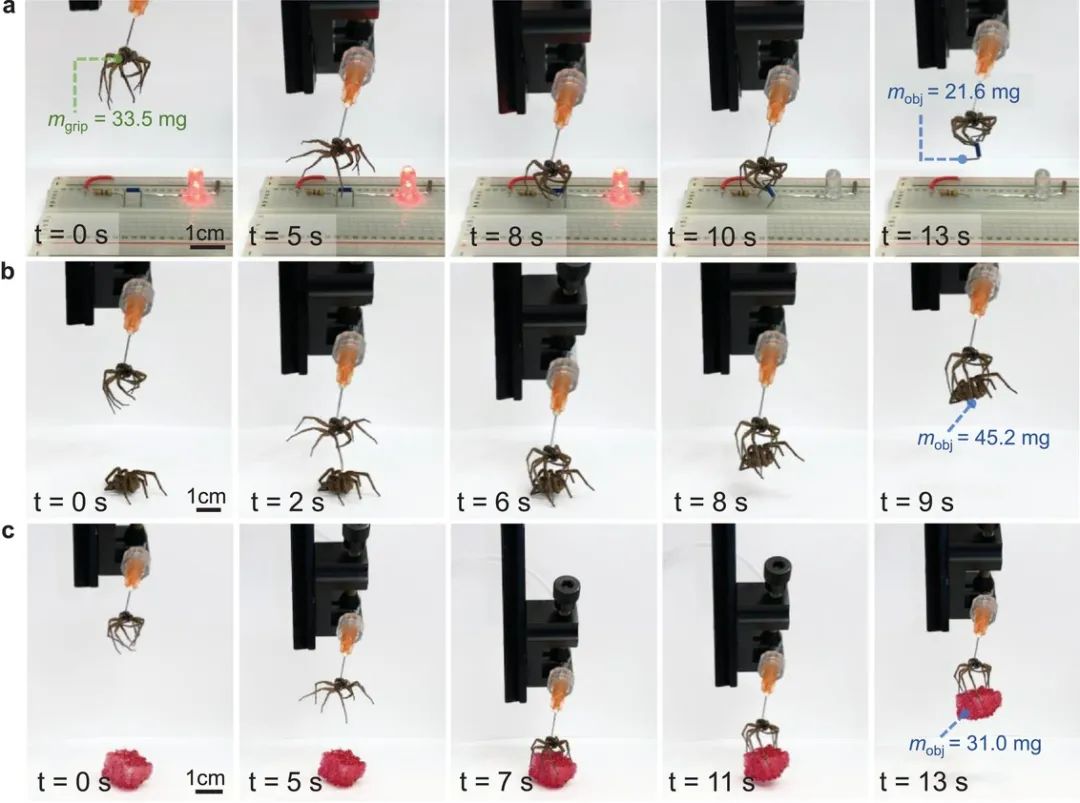 在实验中,死蜘蛛能够抓取几种不同的物体,例如能移除面包板上的跳线以断开LED,能拿起一块染成红色的聚氨酯泡沫,甚至能抓起另一只体重是它1.3倍的大蜘蛛。