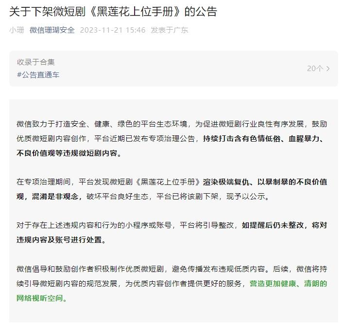 11月21日,微信珊瑚安全发布公告称:在专项治理违规微短剧期间,平台发现微短剧《黑莲花上位手册》渲染极端复仇、以暴制暴的不良价值观,混淆是非观念,破坏平台良好生态,平台已将该剧下架,现予以公示。
