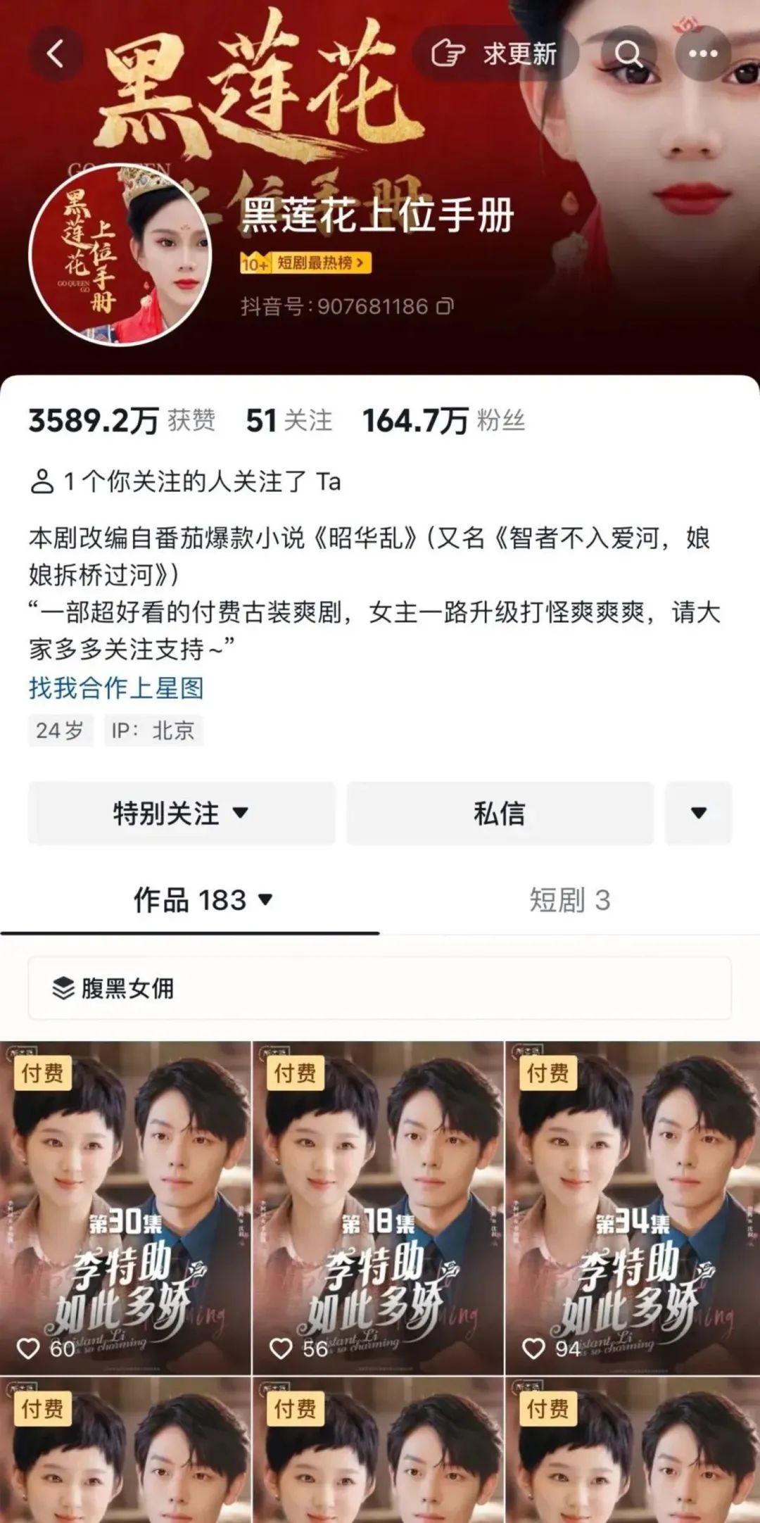 而在抖音平台上,《黑莲花上位手册》的官方账号目前已变成私密账号,所有发布内容都不可见。