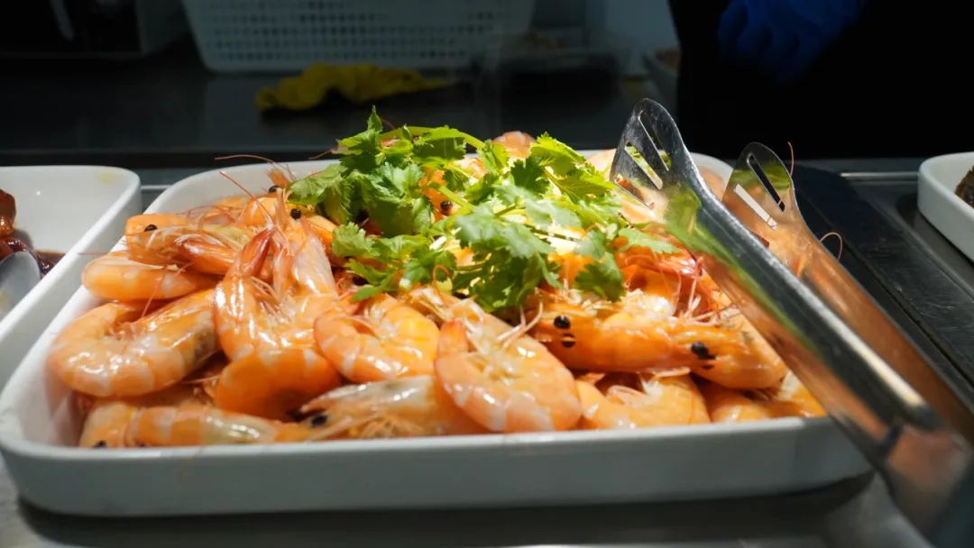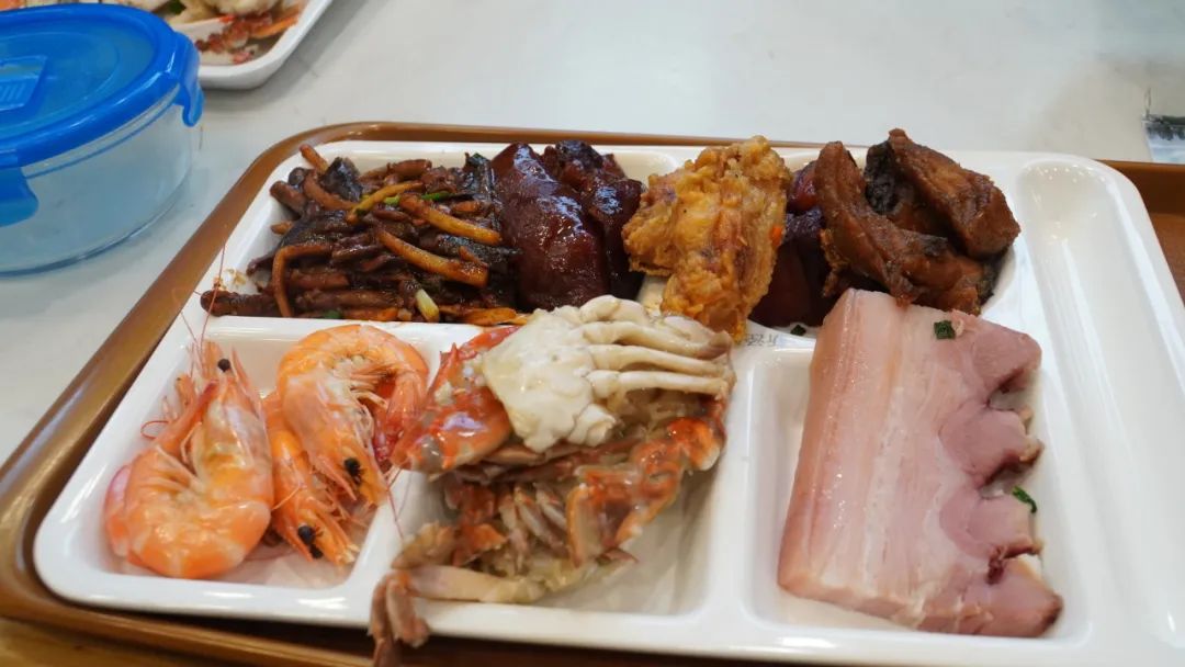 记者看到,洁白的台面上摆放着一盆盆热气蒸腾的菜,水煮虾、西红柿烧鸡蛋、排骨、红烧肉、鳝丝,还有时令的大闸蟹和梭子蟹……不仅种类丰富,而且都是新鲜出炉的。这些菜论斤称重,每斤38.8元,荤素同价!