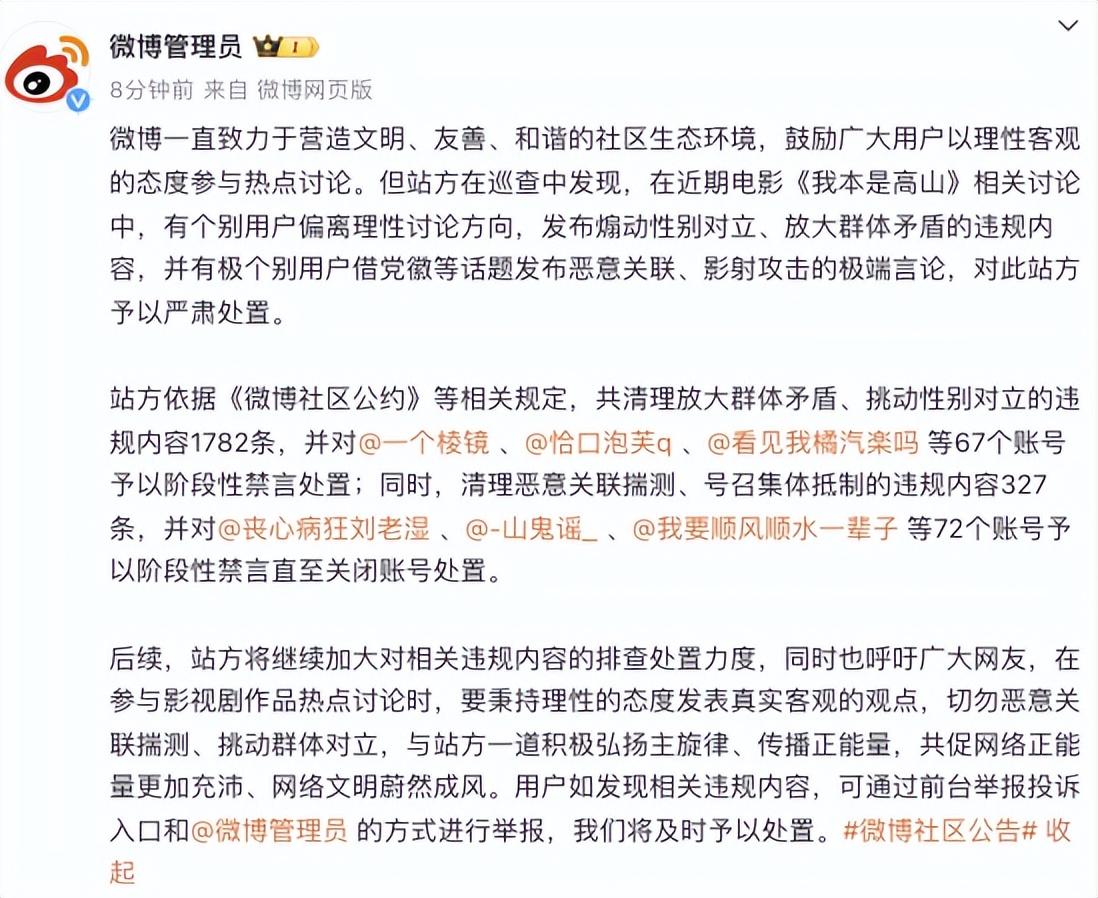 新浪微博社区管理官方微博指出,在近期电影《我本是高山》相关讨论中,有个别用户偏离理性讨论方向,发布煽动性别对立、放大群体矛盾的违规内容,并有极个别用户借党徽等话题发布恶意关联、影射攻击的极端言论,对此站方予以严肃处置。