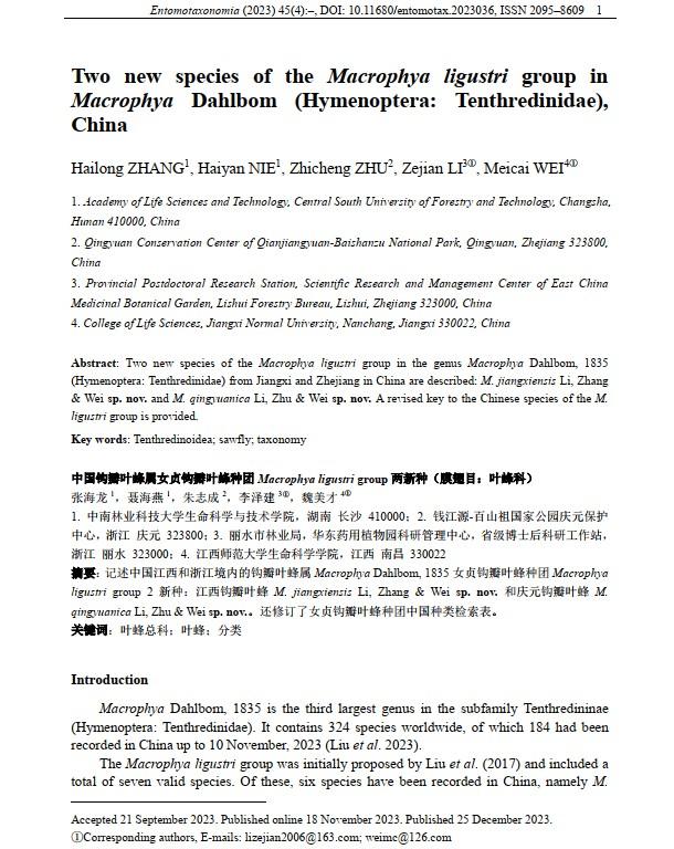 日前,华东药用植物园科研管理中心李泽建博士领衔的丽水市生物多样性保护与资源创新研究团队在钱江源—百山祖国家公园百山祖园区发现新物种:庆元钩瓣叶蜂Macrophya qingyuanica Li, Zhu & Wei sp. nov.,其研究成果发表于中国著名昆虫学杂志《Entomotaxonomia》上。这是百山祖园区创建以来发现的第十八个生物新物种。
