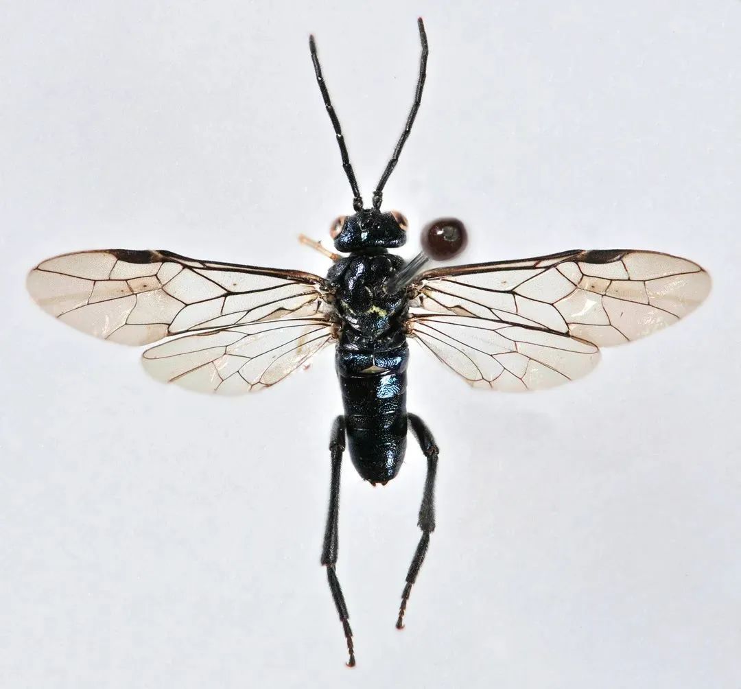 图3 凤阳巨基叶蜂李泽建介绍,今年五一假期,他和庆元保护中心的朱志成组队到百山祖镇黄皮村一带考察。中午时分,一个黑色的虫体在他眼前一闪而过,他上前仔细打量,发现是他博士期间的研究昆虫类群,于是用捕虫网将其捕获。回到丽水后,经过外生殖器解剖等环节,采用比较形态学研究方法,并与近缘种模式标本核对,最终确定该头标本是一个叶蜂新物种。新种种名源自于其模式产地为浙江庆元县,故此命名。