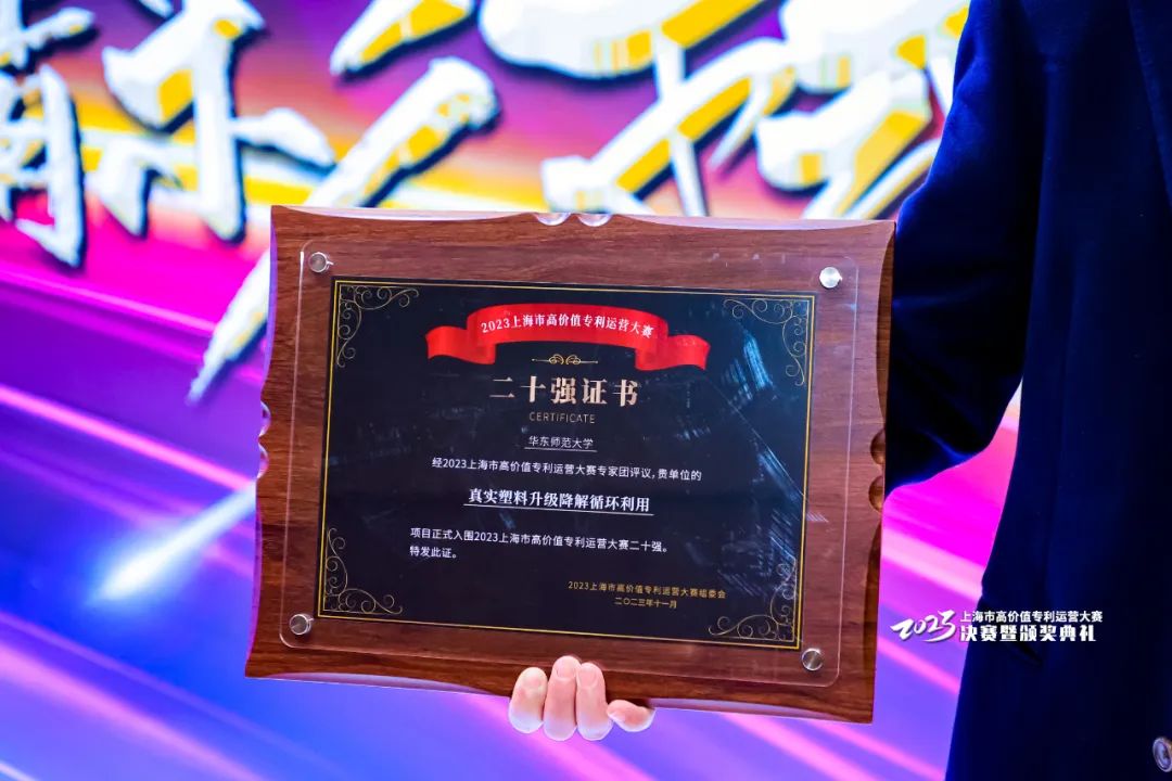 姜雪峰(右二)团队项目获上海市专利运营标杆奖在上海市高价值专利运营大赛上,这一“真实塑料升级降解循环利用”项目备受关注,并获得市场追捧,入围二十强。