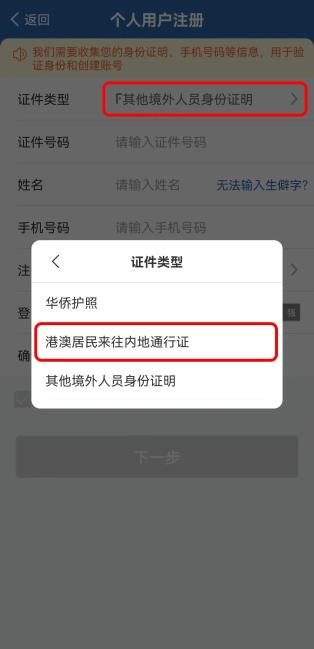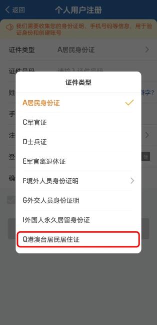 2. 港澳台居民的证件类型可通过选择港澳居民来往内地通行证、港澳台居民居住证进行注册。