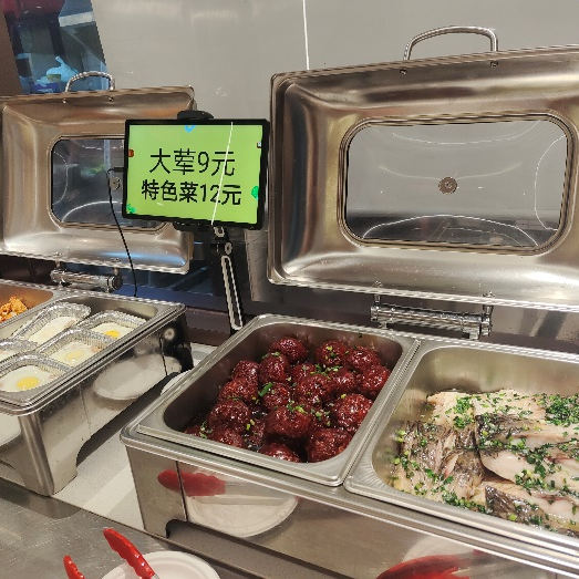 膳宁坊围绕健康膳食与社区服务,提升为老助老品质,打造邻里共享空间,按照两荤两素一汤的标准提供助老“暖心套餐”,同时提供自助餐,60种菜品可供自选。食堂采用智慧结算方式,屏幕上还显示出每道餐品的营养成分和卡路里,为前来就餐的居民提供就餐参考。