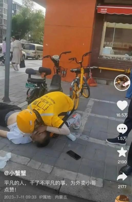 7月11日,23岁的外卖小哥张善荣在送餐途中经过桃李巷,看到一位老人倒在地上,立刻上前跪地救人,为一位口中有鲜血的市民做心肺复苏与人工呼吸,周围的热心市民有人帮忙递卫生纸,有人帮忙拨打120急救电话,大家合力救援,不一会儿救护车到达现场将伤者带走。偶遇枯草起火,警察紧急灭火