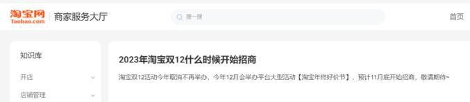 11月24日,据淘宝网商家服务大厅消息,“淘宝双12活动今年取消不再举办,今年12月会举办平台大型活动【淘宝年终好价节】,预计11月底开始招商。”