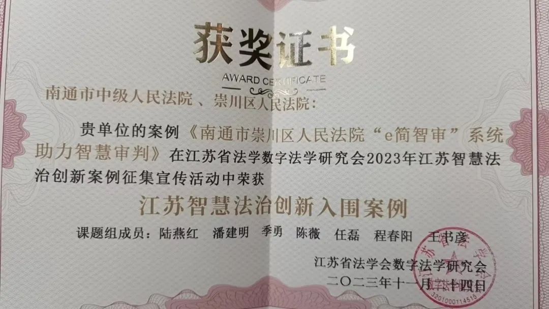 11月24日,在江苏省法学会数字法学研究会2023年年会暨第七届司法大数据研究与应用研讨会中,南通中院和崇川法院联合报送的《南通市崇川区人民法院“e简智审”系统助力智慧审判》被评为江苏智慧法治创新年度入围案例。下一步,崇川法院将以“e简智审”系统的建设为契机,继续探索全流程无纸化办案模式,深入推进现代科技与法院工作的双向融合,提升办案质效,实现让公平正义更加可触、可感、可见。