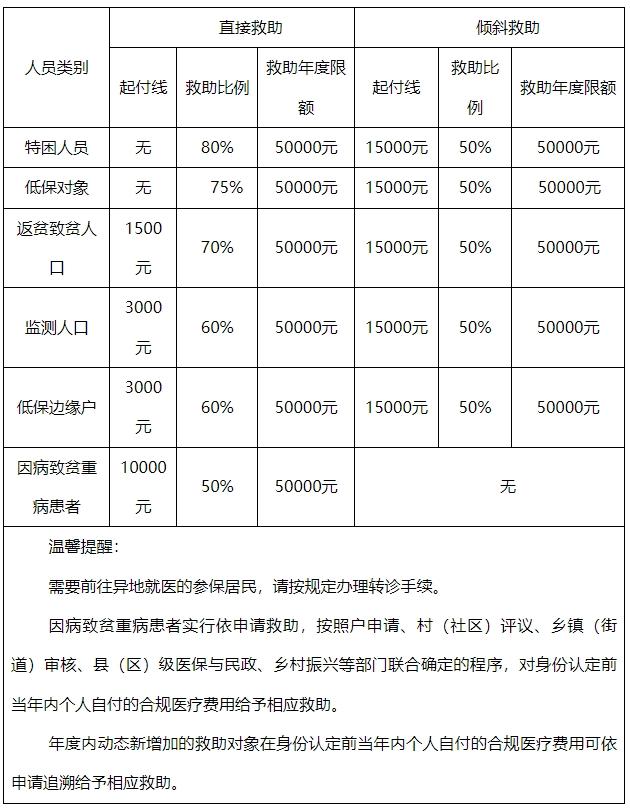 答:按救助对象分类设定年度救助起付标准、救助比例。对救助对象在参保地定点医疗机构或按规定转诊异地就医发生的合规医疗费用,经基本医疗保险、大病保险等报销后的个人自付部分按规定给予救助。对规范转诊且在省域内就医的特困、低保、低保边缘户、返贫致贫人口、防止返贫监测对象,经三重制度综合保障后政策范围内个人负担仍然较重的给予倾斜救助。