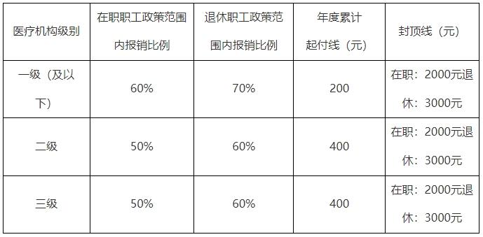 答:参保人员在定点医疗机构住院发生的医药费用,享受报销待遇。在不同级别医疗机构住院,起付线、支付比例均不相同,级别越低的医疗机构起付线越低,报销比例越高。具体如下: