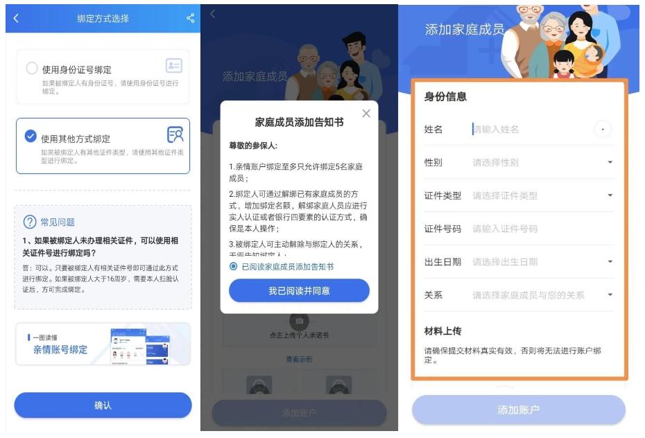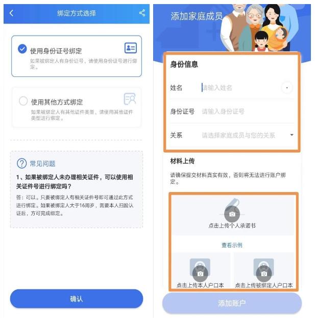 【温馨提示】如果您添加的家庭成员小于16周岁,直接点击【添加账户】按钮即可完成账户关联。