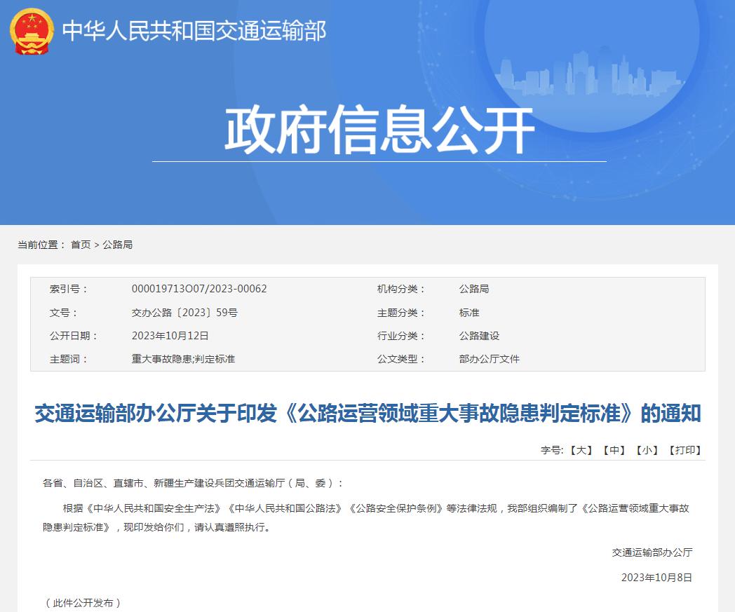 第三条 本标准所称重大事故隐患是指极易导致重特大安全生产事故,且危害性大或者整改难度大,需要封闭全部或部分路段,并经过一定时间整改治理方能消除的隐患,或者因外部因素影响致使公路管理单位自身难以消除的隐患。