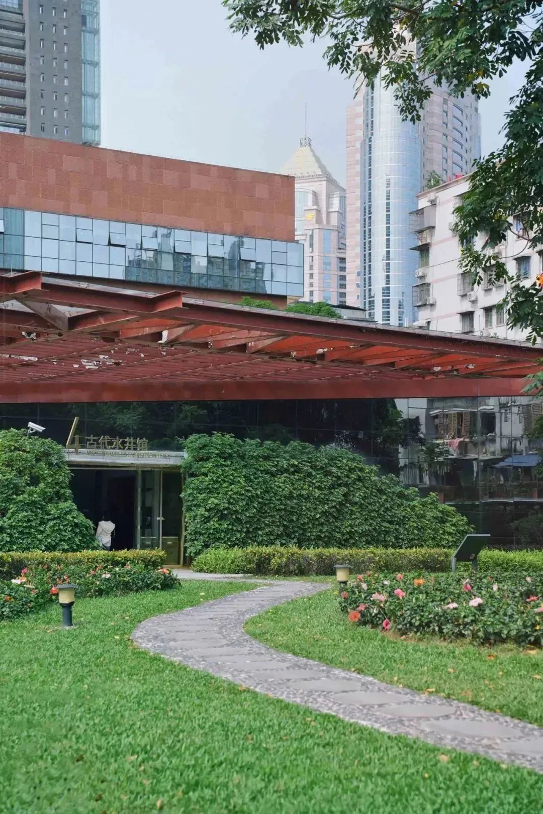走进深处,站在一处的一楼就可以平视另一处的三、四楼,低头甚至还可以俯视高大的绿化树木。