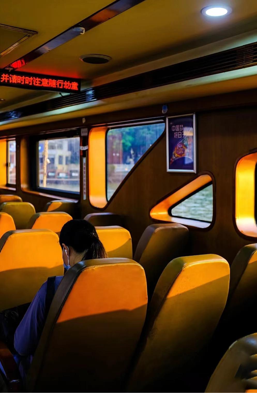 靠近窗户的位置,是欣赏沿岸江景和日落的最佳选择。金色的光照在船上,仿佛一切都被镶上了金边。