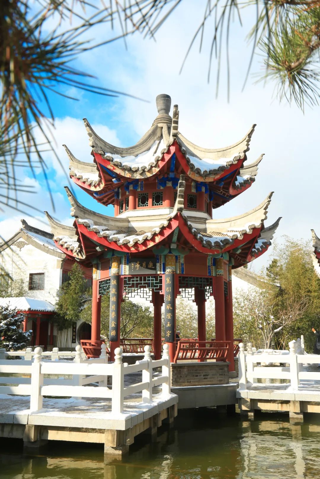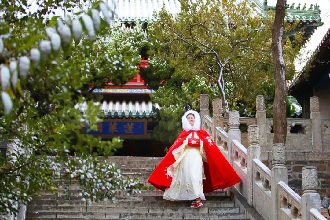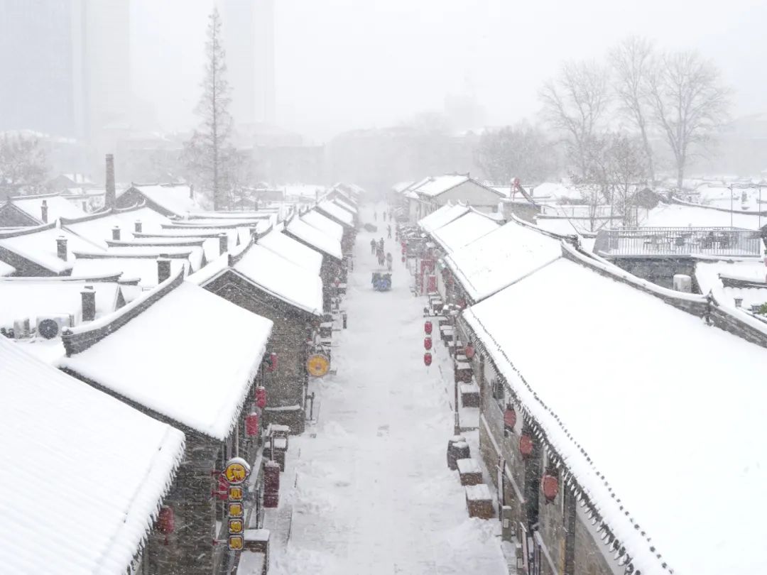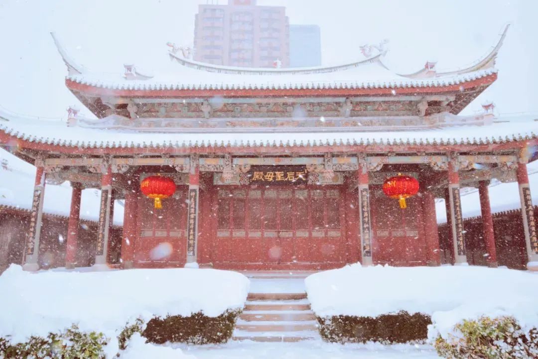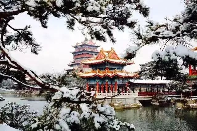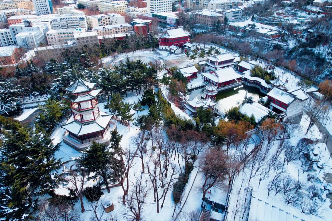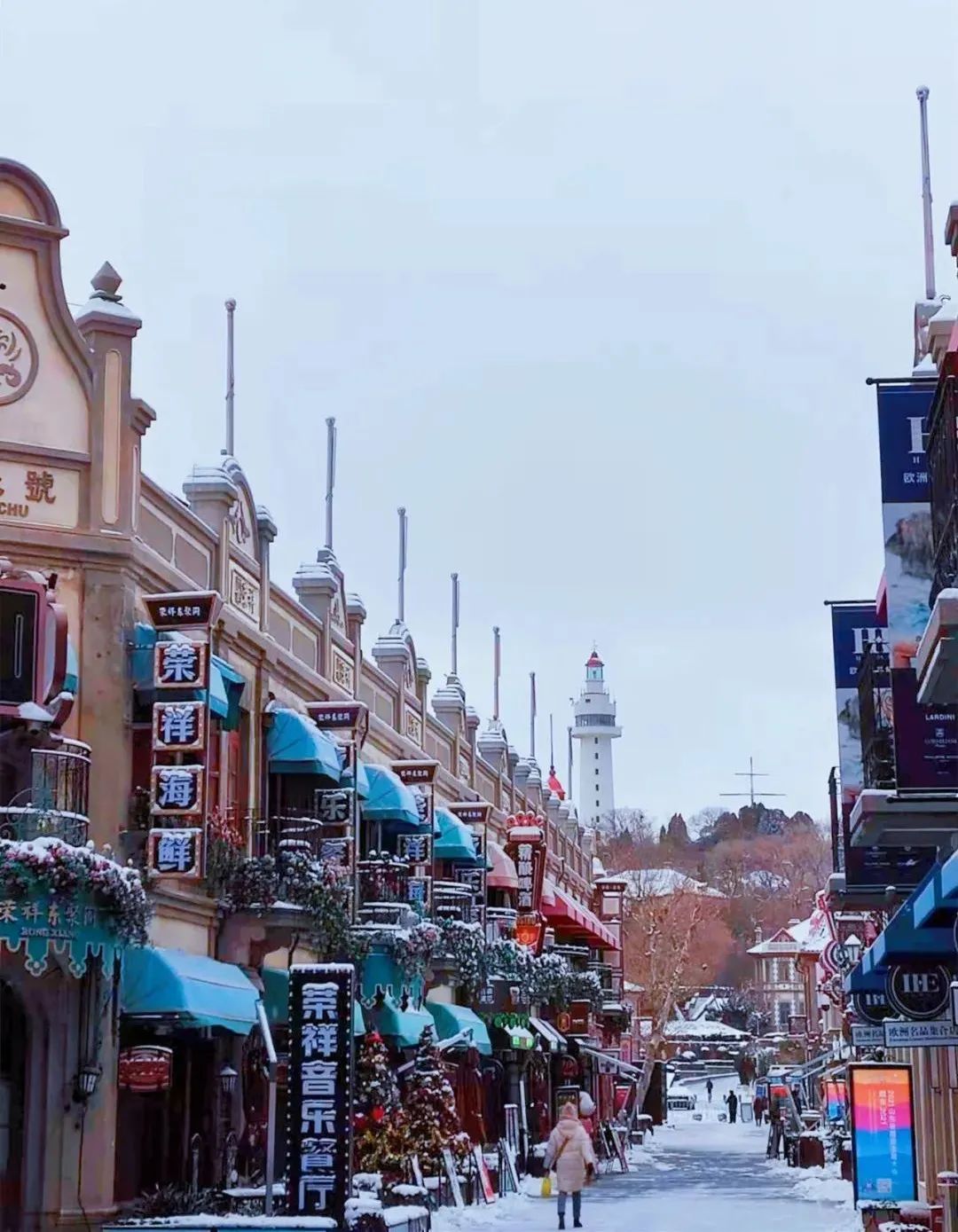 落雪的烟台,每一帧都像是电影里的场景。大雪飘然而至,古香古色的亭台楼阁,那绝对是一番诗意盛景,令人着迷。