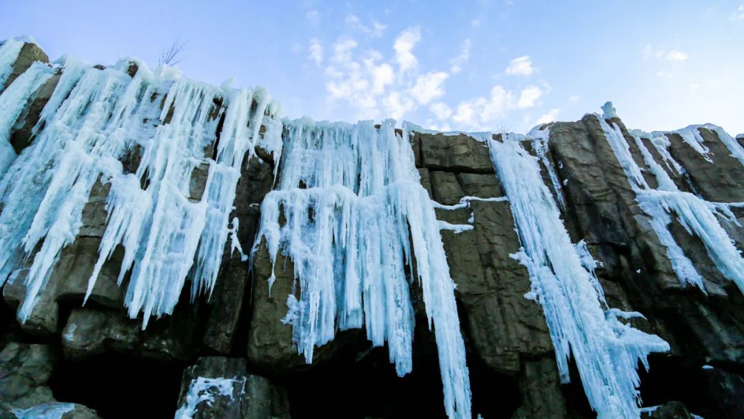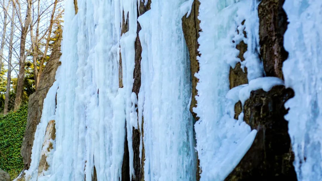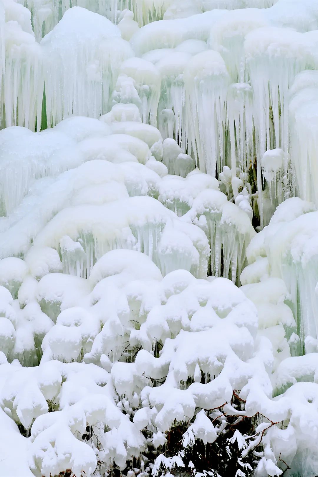层层叠叠的冰凌不断累积,将瀑布一泻千里的姿态定格,宛若一件件精心雕刻的艺术品,经阳光折射后色彩斑斓,无论何种角度欣赏,都能感受到难以言喻的壮美。