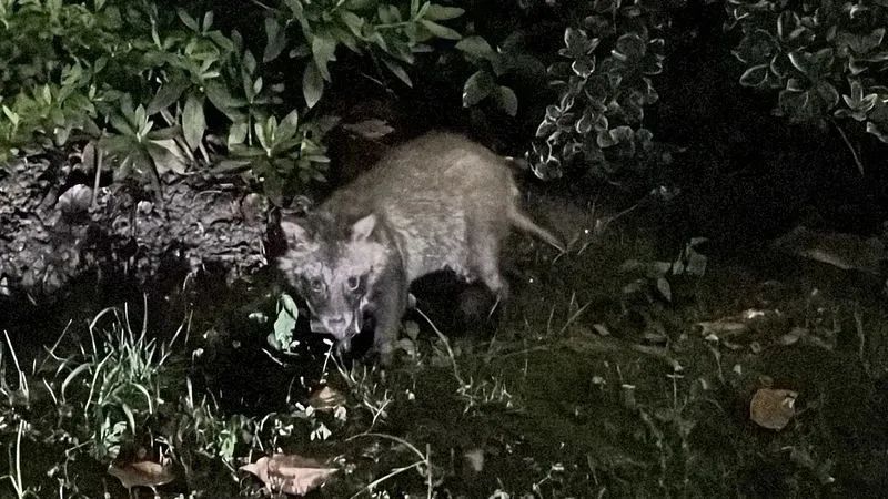 志愿者在调查小区时拍到的貉,佩戴了GPS项圈