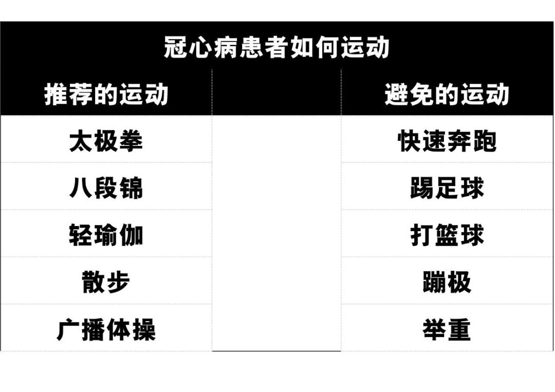传统的低强度有氧运动如散步、轻瑜伽、慢跑有利于改善心肺功能,减重减脂进一步可以减小冠脉粥样硬化的风险,改善血管功能障碍。中国传统的一些操类活动如八段锦、太极拳也是不错的选择,强度等级不高,却利于坚持,不仅可以使心肺功能得到提高,而且可以有效缓解压力,减少精神方面的诱因。