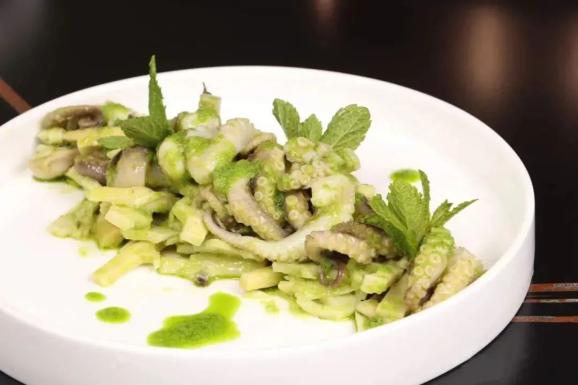 用香葱泥、藤椒酱和青芥辣三种绿色食材调拌主料,赋予八带和竹笋呛辣的味道和清新的卖相。批量预制: