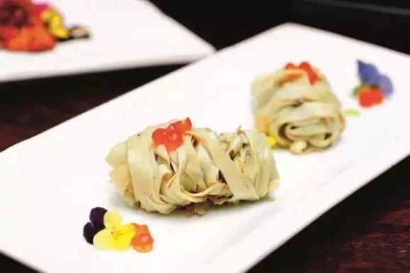 杏鲍菇切成长条后先油炸再汆水,加青麻鲜、葱油拌入味,缠成小卷 ,远看犹如两团面条一般,小巧可爱。原料: