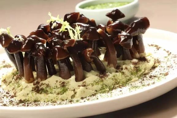 此菜特色在于选料和搭配:以人工培育的鸡枞菌入菜,长约5厘米,呈棕褐色,玲珑可爱,香气浓郁;辅料使用土豆泥,加自制绿茶粉调匀,铺入盘中变为“土地”,鸡枞菌“破土而出”,显得生机勃勃;烧椒酱跟着上桌,取原料蘸食而不调拌,成菜更清爽。制作流程: