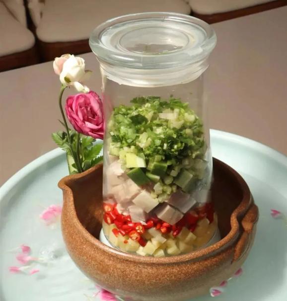 2.上桌后,将味汁倒入玻璃罐中,用力上下摇动30秒,待味汁渗入原料中,打开玻璃罐,将原料倒在小缸内即成。