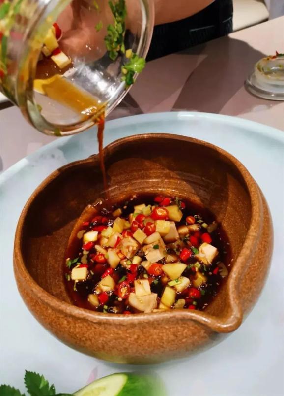 姜蓉15克纳盆,将烧至八成热的葱油30克淋在姜蓉上激出香气,加鸡汁3克、醋、味精各2克调匀即成。
