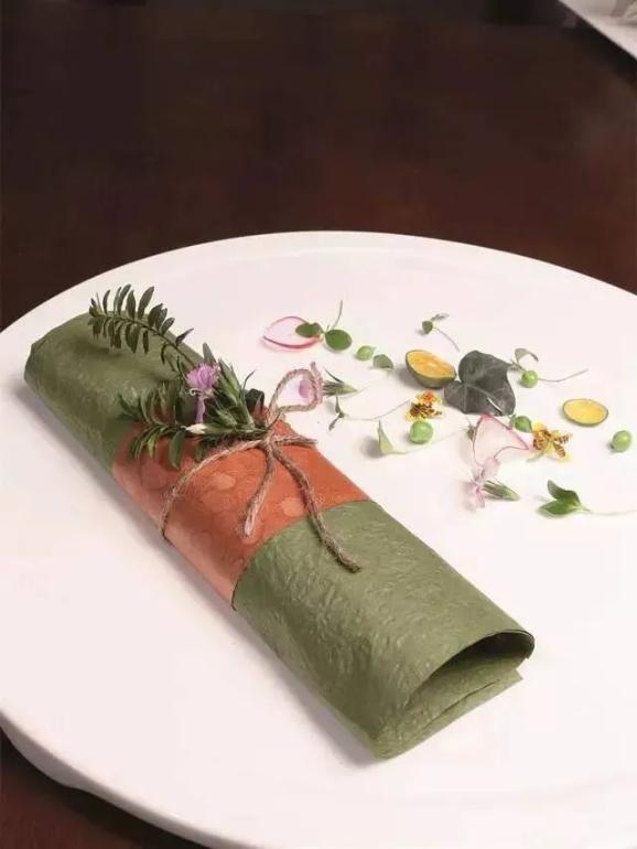 取鹿肉200克(拣掉多余料头)放入锡纸,表面撒少许白芝麻点缀,包紧收口后裹上外层的包装纸,按图装盘即成。