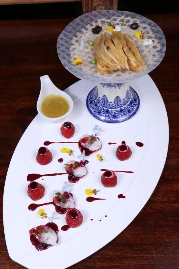 取做好的鸡腿150克改刀成片后装盘,点缀草莓、蓝莓以及蒸熟的山药泥,挤上适量蓝莓酱,带一碟姜汁味碟即可上桌。