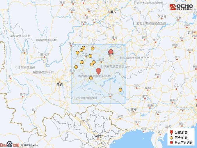 历史地震:根据中国地震台网速报目录,震中周边200公里内近5年来发生3级以上地震共14次,最大地震是2021年11月24日在贵州贵阳市修文县发生的4.6级地震(距离本次震中182公里),历史地震分布如图。