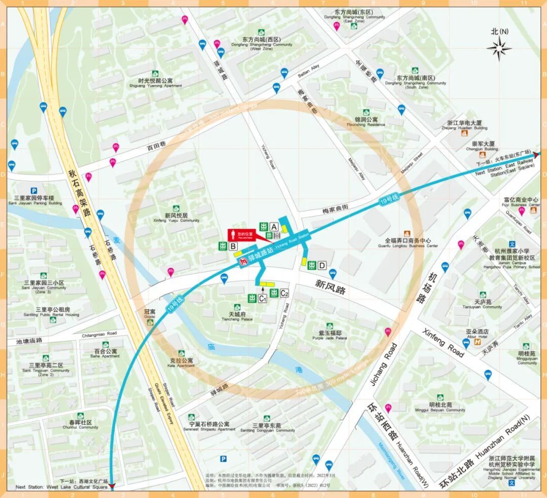 驿城路站位于上城区驿城路与新风路交汇处,东西向布置。车站为地下站,地下一层是站厅层、地下三层是站台层,站台为岛式站台,本次开通A口、B口、C口。驿城路站装修设计以“宋瓷神韵”为主题,提取杭州宋瓷为元素对空间进行设计,轻巧悦目,式样美观多样,体现具有江南韵味的传统手工艺术瓷器的传承和观赏性。