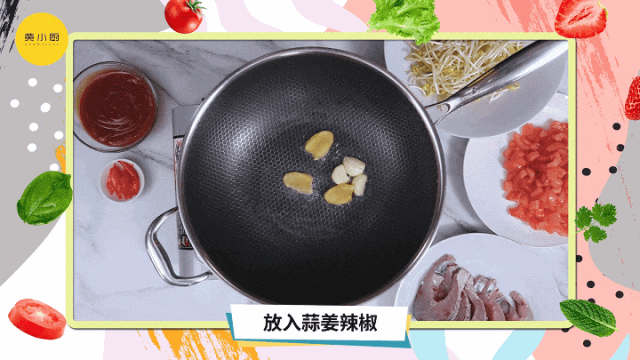 去除鱼线,鱼切段;番茄表面滑十字后放入热水中烫一下,皮剥完后将其切成适当大小的番茄丁;