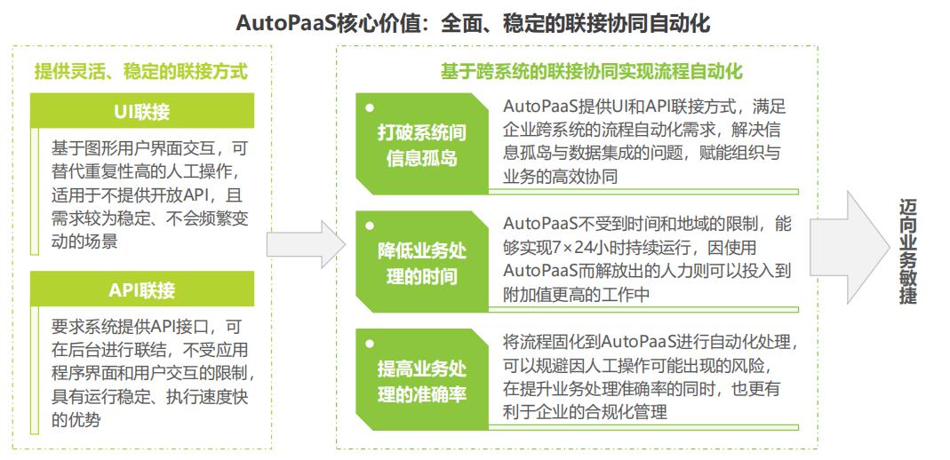 在白皮书中也首次提出了“AutoPaaS”概念,它是指有统一管理、使用界面,统一技术底座的PaaS产品,既可以设计出UI自动化应用,又可以通过API调用、编排的方式,设计出让企业系统在底层联通的应用,帮助企业实现系统联结与业务自动化执行的目标。