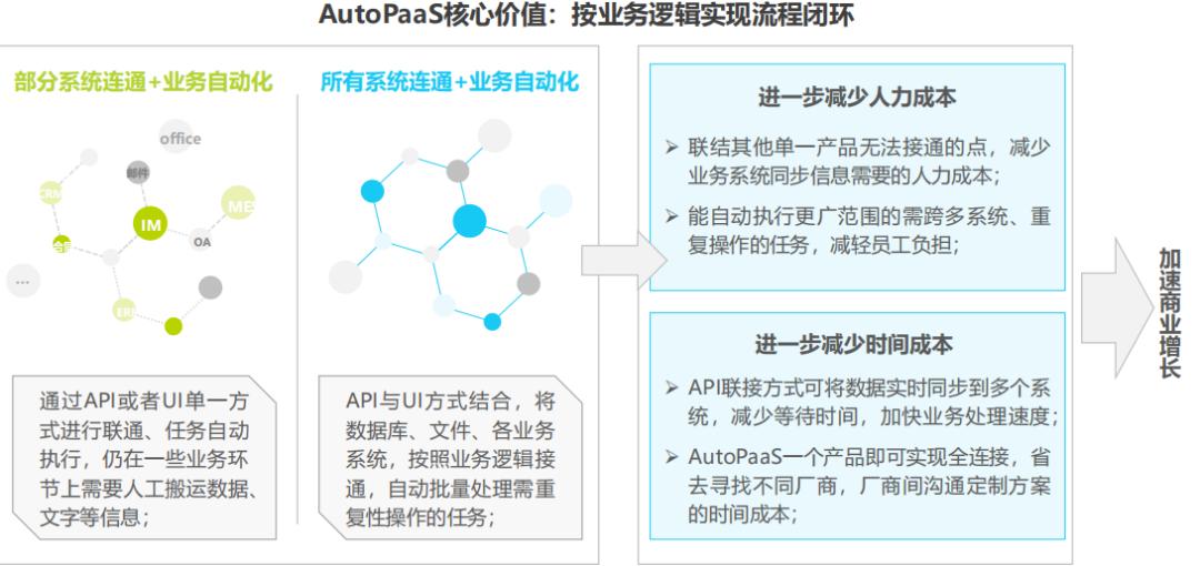 AutoPaaS产品,它同时具备API、UI两种联结能力,为企业提供更加灵活的选择,它能够全面覆盖企业内部、外部跨系统的协同需求,以更加稳定的方式应对复杂系统的联接需要。从而突破业务联结边界,进一步降低人力时间双成本,加速企业实现商业增长。