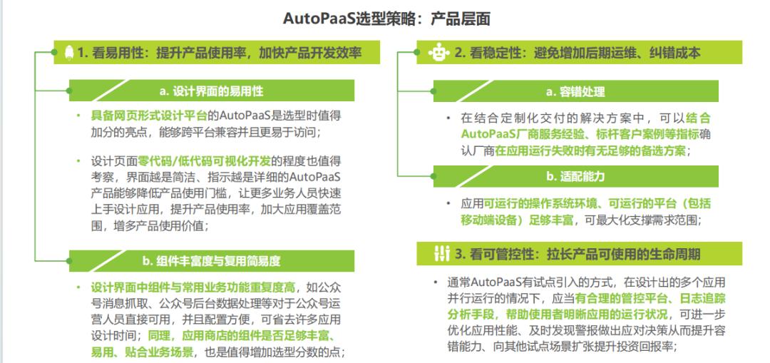 白皮书还指出,企业在选择AutoPaaS产品时,可以分别从产品和生态两个方面来考虑。从产品层面,可以选择易用性、稳定性、可管控性角度上层级更高的产品。