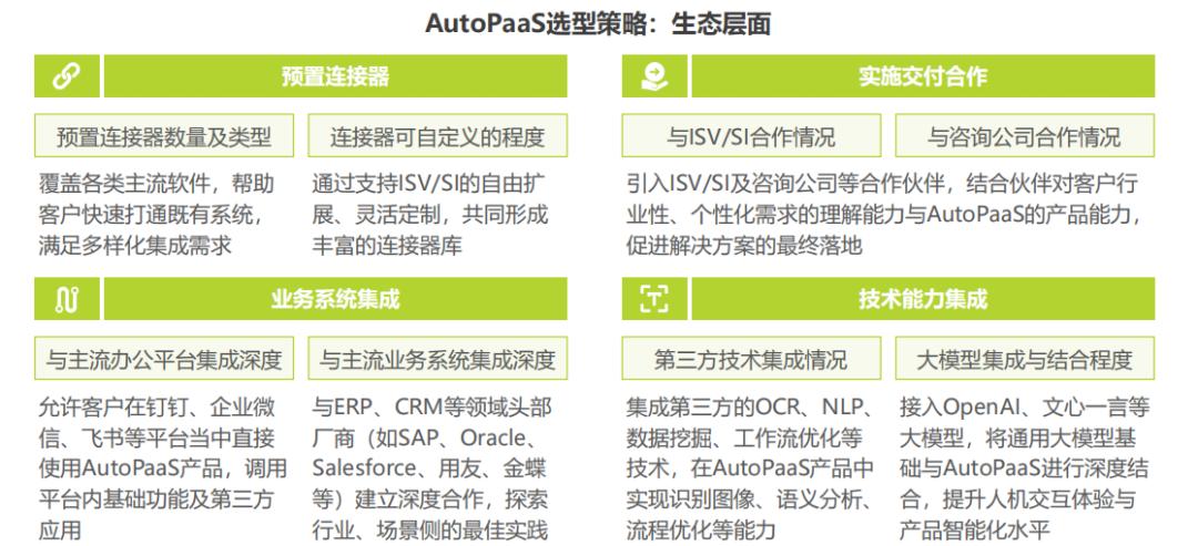 从生态层面来说,AutoPaaS生态体系所覆盖的业务系统、技术能力与客户需求的匹配度越高,越能够帮助企业降低跨系统联结的壁垒。