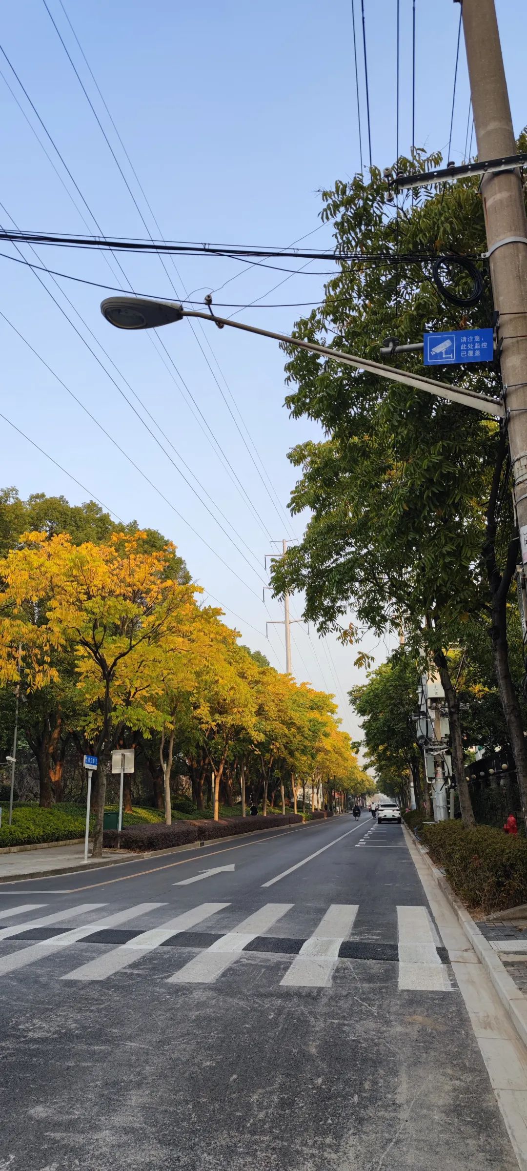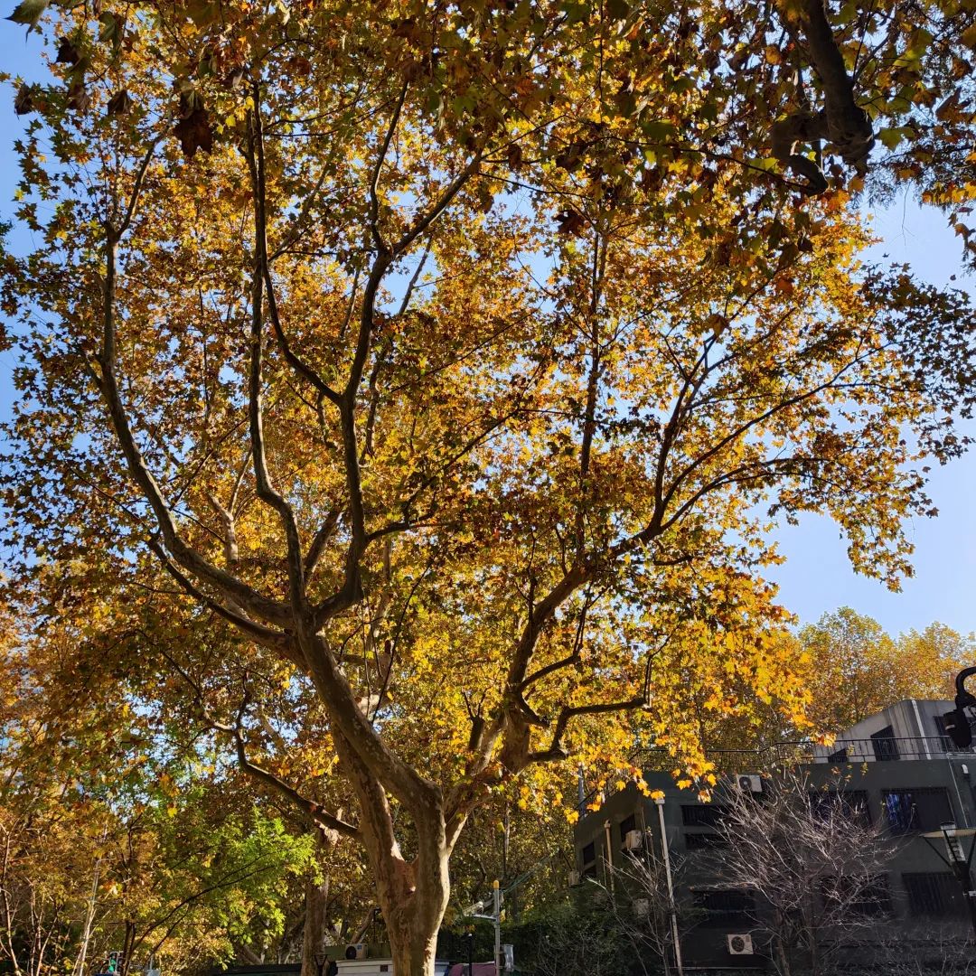 悬铃木一般指二球悬铃木,由法国人带到上海,栽在霞飞路(现今淮海中路),因其叶子似中国的梧桐,被人们叫作“法国梧桐”。树形高大,在城市中常用作行道树,衡复地区多条道路都有种植法国梧桐,它们整齐地站在道路两边,就像城市的守护者。深秋的法桐树叶色变黄,它枝干古朴苍劲,树身挺拔,冠大如华盖,遮天蔽日,于是整个城市都被染上了一抹黄。白蜡