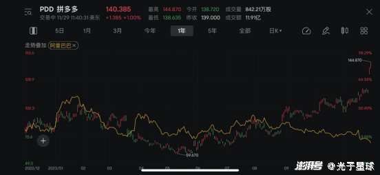过去一整年,拼多多与阿里巴巴美股K线对比图