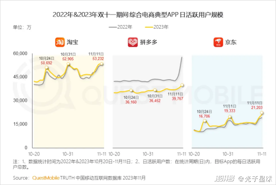尽管当下主流电商平台不再披露详细的月活、ARPU等可供直接分析的数据,但根据第三方机构Questmobile所发布的《2023年双十一洞察报告》仍然可以窥探“人”的聚集情况。报告显示,拼多多在今年双十一期间,DAU规模整体上低于淘宝,但在11月11日收官时——交易集中释放节点,反超了淘宝。