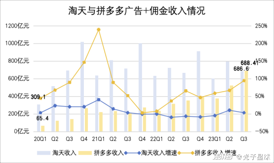 第三季度,淘天由广告+佣金组成的客户管理收入为686.6亿元,同比增长3%。由于拼多多的收入主要由在线营销(广告)+交易服务(佣金)组成两个板块构成,因此其总收入便与淘天“客户管理收入”存在可比性。