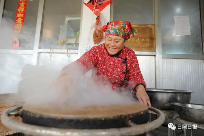“最近,随着地瓜陆续收上来,地瓜煎饼也迎来一年的生产旺季。这一个冬天差不多能加工30万斤鲜地瓜。”张吉花介绍,“以前条件不好,顿顿都是地瓜煎饼。年龄大点的妇女,都会摊煎饼这个手艺。”2014年,一个偶然机会,张吉花了解到外地的手工地瓜煎饼,卖到十几元一斤,且供不应求。她想到,自己家里也种了几千斤地瓜,可以尝试一下做手工煎饼。说干就干,2014年冬天,她每天凌晨五六点钟起床,便一头扎进地瓜堆,挑选、清洗、去皮、蒸煮……2个月的时间,把自家种的5000多斤地瓜,加工成了1000多斤地瓜煎饼。加工过程中,她还通过熟人联系批发商和发布微信朋友圈,很快就卖出去了。一算账,12元一斤的地瓜煎饼,收入1.5万元,这大大超出她的预期。