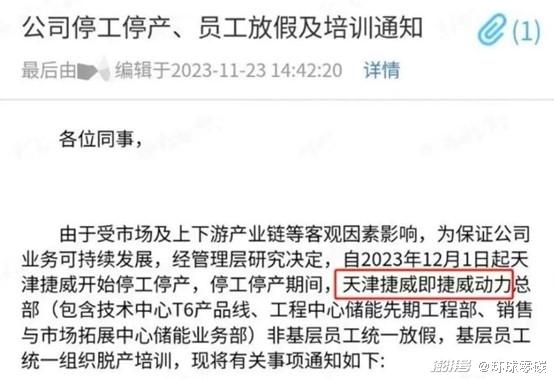 就在不久前,行业再次引发“地震”。一则天津市捷威动力工业有限公司(简称捷威动力)的《公司停工停产、员工放假及培训通知》被传开,通知显示捷威动力计划自12月1日起停产,复工时间将根据公司经营情况另行通知。